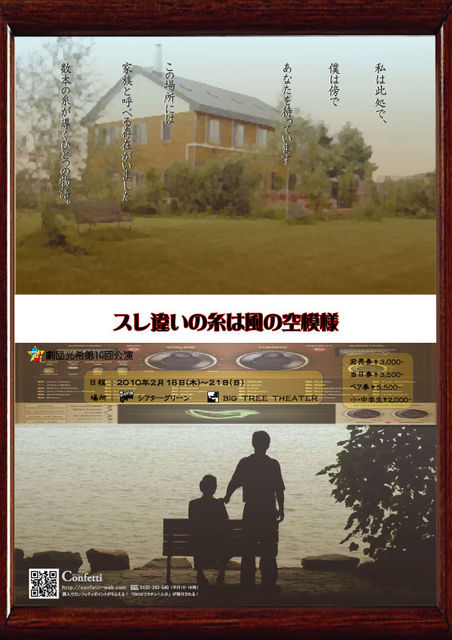 始めて情報をアップします。 よろしくお願いいたします<m(__)m> 愛や友情、思いやりを丁寧に磨いた作品です! ☆★☆★☆劇団光希創立10周年記念公演『スレ違いの糸は風の空模様』☆★☆★☆ 山深い里にひっそりとたたずむ小さなペンション、「丘の家」。 家族のように暮らす三人が切り盛りするこの家は、いつもにぎやかな笑い声があふれ、ゆったりとした時が流れていた。 そんなある日、25年前の約束を果たすためにある客が訪れる…。 すれ違う心と心が絡まって、新たなドラマを紡ぎだしていく。 笑いあり、涙あり、友情あり!2010年