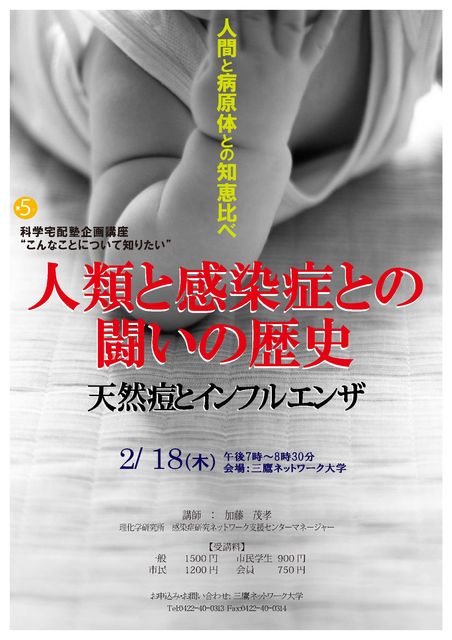 人類が初めて根絶した天然痘と、最後まで残るといわれているインフルエンザ。その違いの謎は? 理化学研究所感染症ネットワーク支援センター情報チームマネージャーの加藤茂孝さんが、 天然痘とインフルエンザを例にあげて、人類と病原体との知恵比べの歴史について語ります。 日時 : 2月18日 木曜日 時間 : 午後7時〜8時30分 定員 : 40名 受講料 : 一般1500円 市民1200円 市民学生900円 会場 : 三鷹ネットワーク大学 (三鷹市下連雀3-24-3三鷹駅前協同ビル3階 電話0422−40−0313 ) インタ