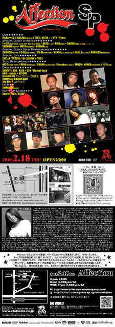 Affection 2010年2月18日(木) club asia 渋谷区円山町1-8 TEL 03-5458-2551 OPEN 23:00 W/F \2500/1D DOOR \3000/1D DAY 3,000yen/1d ■SPECIAL GUEST DANDER 7☆SP HERO(至芸)+PINO(ALMA)+SHUHO(HOUSE OF NINJA/シャブレイ) TAISHOW(ZENITH)+METH(XXX-LARGE)+YOSHIO(S.A.S) ■SPECIAL GUEST SOLO DANCER SHINICHI(BUTTER) U-GE(SOUL 2 SOUL) YU-KI(PRIME TIME) KENTO(S.T.O/SPEED STA) NAMI.J(U.S.A INC) HORIKOU(BAD ASS!!!!!) ■SOLO DANCER NATO(DIGGIN' PROPS) RENO(DISCO DadZ) CHABO(YELLOW PUZZLE)