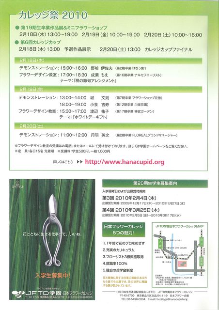 プロのフローリストを養成する、「JFTD学園日本フラワーカレッジ」が開催する【カレッジ祭2010】において、フラワーデザイン教室を行います。 ■フラワーデザイン教室 ・2月18日(木)17:00〜18:30 テーマ:「桃の節句アレンジメント」 講 師:成瀬もえ(ナルセフローリスト) ・2月19日(金)15:30〜17:00 テーマ:「ホワイトデーギフト」 講 師:渡辺祐子(神宮ガーデン) 定 員:各回15名(先着順) 参加費:学生500円、一般1,000円 申込は下記のメールまたはお電話にて受け付けております。 メール:f-co