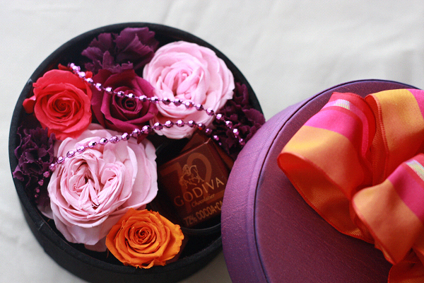 スイートバレンタイン1DAYレッスン★お子様連れ大歓迎 〜エスプリ香るROSE BOX 管理人さま貴重なスペースをお借りいたします。 東京の江東区にてお子様連れできるプリザーブドフラワースクール 「フルール・ド・ボヌール」です。 来月2月はバレンタインですね サテン生地貼りのゴージャスなBOXへROSEをた〜っぷりと詰め込んで 更に、GODIVAのカカオ72%のショコラを一緒にアレンジ ショコラの下には真紅のガラストレイが置いてあります。おいしく頂いた後は、ガラスのトレイにマリッジリングやピアスなどを入れ