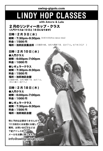 2月のクラスの場所が変わりました。 お間違いなく! ●リンディーホップ入門クラス レギュラークラスの前の時間に、 初めての方から初心者の方向けのクラスを月に二回行います。 8カウント、スイングアウトの基本の仕組みを説明するクラスです。 時間の合う日にお気軽に受けてみて下さい。 ●日時:2月10日(水) 時間:午後6時から7時 場所:池尻区民集会所 / IKEJIRI KUMIN-SHUKAIJO (田園都市線、池尻大橋駅下車,徒歩7分。地下にある広いウッドフロアです。) http://www.mapion.co.jp/m/35.6465919444444_139.681940833333_8/