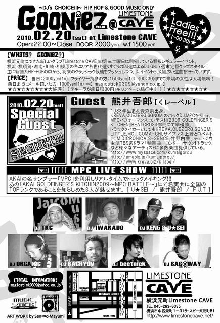 次回、GooNieZ Vol.10は「2010/02/20」開催! GUESTにはKREVAが率いる「くレーベル」の看板トラックメイカー&DJ 「熊井吾郎」が横浜に初の単独出演。 http://mixi.jp/view_community.pl?id=2158653 AKAI主催MPCバトル2009において優勝したGooNieZレギュラー「U☆SEI」と 決勝出場した「F.U.T」と「熊井吾郎」の3人によるMPC LIVE SHOWも行うという 豪華内容!!! もちろんおなじみのレギュラーDJ陣も皆さんのツボをついたプレイをすること間違いなし。 ------------------------------------------------------------ ●開催場所