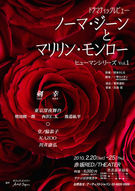 舞台『ノーマ・ジーンとマリリン・モンロー』 http://www.red-theater.net/article/13615319.html ■出演  剣幸/堂ノ脇恭子/川井康弘/  東京深夜舞台(増田修一朗・西沢仁太・渡邉紘平) ■脚本 一雫ライオン ■日程    2月20日(土)17:00     21日(日)14:00     22日(月)18:30 ※アフタートークあり!     23日(火)18:30     24日(水)18:30 ※アフタートークあり!     25日(木)14:00 ※22日(月)及び、24日(水)は終演後にアフタートークを行います! *司会は一雫ライオン。  増田修一