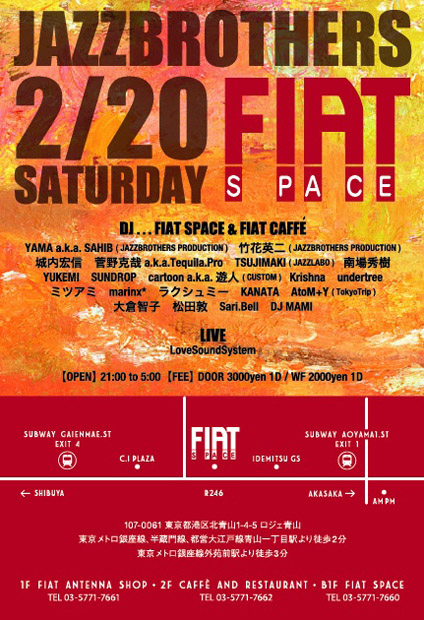 土曜日はいよいよ北青山にできたFIAT SPACE&FIAT CAFEでDJをします。 このスペースは皆さんご存じ イタリアのカーブランドFIATがスポンサーのITALIAN LOUNGE&BAR。 噂によると音響設備はもちろん、照明設備も充実しているようです。 以前我が師の友人Yさんが、このスペースでDJをしているとのことで 遊びに行こうとしたら、すでにイベントが終了していました。 まだ行ったことのない環境でDJをするのがとても楽しみです。 そんな環境のよさはもちろん、 心地よい選曲で皆さんをおもてなししたいと思っています。 是非遊びに来てください。