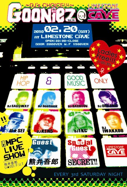 次回、GooNieZ Vol.10は「2010/02/20」開催! GUESTにはKREVAが率いる「くレーベル」の看板トラックメイカー&DJ 「熊井吾郎」が横浜に初の単独出演。 http://mixi.jp/view_community.pl?id=2158653 AKAI主催MPCバトル2009において優勝したGooNieZレギュラー「U☆SEI」と 決勝出場した「F.U.T」と「熊井吾郎」の3人によるMPC LIVE SHOWも行うという 豪華内容!!! もちろんおなじみのレギュラーDJ陣も皆さんのツボをついたプレイをすること間違いなし。 ------------------------------------------------------------ ●開催場