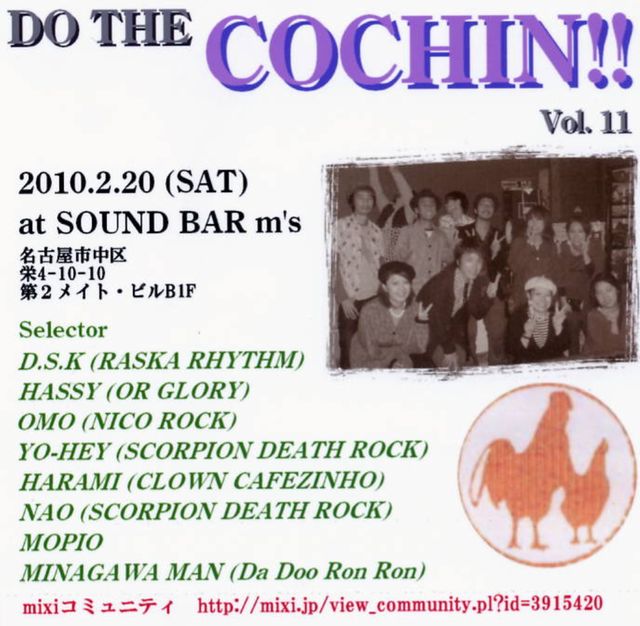 「Do the COCHIN!! Vol.11」 2010.2.20(sat) @栄BAR M'S http://soundbar-ms.com/index.html 21:00 start チケット:1500yen with 1DRINK+1CD(先着30名様) SELECTOR D.S.K (RASKA RHYTHM/NATUREAL ROCKERS) OMO (NICO ROCK) YO-HEY (SCORPION DEATH ROCK) HASSY (OR GLORY) HARAMI (clown cafezinho) NAO (SCORPION DEATH ROCK) MOPIO 皆川マン (Da Doo Ron Ron) 前回のイベントの模様はこちら↓ さてさて新しい年となりました。 みなさん、いかがお過ごしでしょうか。 今