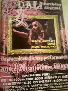 ◆◆2月20日(sat)魔女 DALI SPECIAL(HOME-MEGA)◆◆ Unprecedented crazy performance ★PsyconnectioN Birthday SPECIAL★ 2010年2月20日(sat) Open 22:00〜5:30 【ENTRANCE FEE】 前売り5500yen ※限定500枚 前売り〆切 2/10迄 ON THE DAY 6000yen SPECIAL GUEST ACT ★DALI(HOM-MEGA/isr) http://m.mixi.jp/view_community.pl?id=216931&guid=ON SPECIAL DJ SET ★KLOWD(SOLSTICE MUSIC/BLISSDOM RECORDING) http://m.mixi.jp/show_friend.pl?id=18501138&route_trace=010000400000&guid=ON