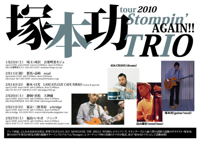 アンプ直結、こんな音を出せる男は、世界でただひとり。 SLY MONGOOSE、THE HELLO WORKS(スチャダラパー×SLY MONGOOSE)、ピラニアン ズ、ネタンダーズと八面六臂の活躍で話題のギタリスト・塚本功。 2007年11月にリリースされた彼の現時点での最新ソロアルバム『Stompin’』はドラ ムASA-CHANG、ウッドベース長山雄治、そしてギター塚本功のトリオでレコーディン グされた侠気全開の超絶ギターインスト!日本最高峰のトリオから放たれるの は、ヤクザなイタリア人も真っ青な素敵なロックンロール!スウィング!ブルー ス!埃まみれのマカロ