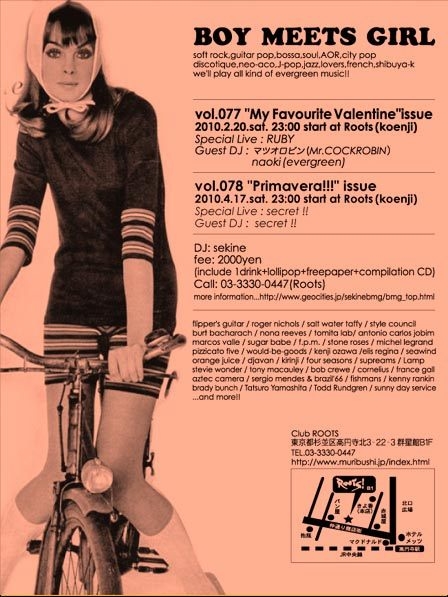 小沢健二、ライヴにて復活、というニュースが巷間駆け巡る中、 新年一発目のBMG、いよいよ詳細の発表です! --------------- 2月の「ボーイ・ミーツ・ガール」はヴァレンタイン&ホワイトデイ・スペシャル! アルバムリリースを控えたエレクトロポップユニットRUBYがBMG初登場! 浮遊感あるウィスパリング・ヴォイスをお楽しみください!  ゲストDJにはMr.クックロビンのリーダー&ヴォーカル、マツオロビンが登場! 自身の曲のルーツをたどるネオアコ〜ギターポップ〜渋谷系な選曲で華を添えます! そして、横浜の夜をダンサブルなポップス
