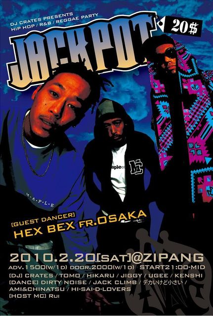 JACKPOT20$ 2010.2.20(sat)@ZIPANG ■21:00-MID [GUEST DANCER]HEX BEX fr.OSAKA [DJ]CRATES / TOMO / HIKARU / JIGGY / UGEE / KENSHI [DANCE]DIRTY NOISE / JACK CLIMB / デカいけど小さい / AMI&CHINATSU / HI-SAI-D-LOVERS [HOST MC]Rui [TICKET]adv.1500(w/1d) door.2000(w/1d) 「HEX BEXプロフィール」 関西のHIP HOPシーンの核弾頭になるべくして生まれ た、HONGOU、KUSAKAWA、CHEKEこの三人から出るグルーブ感 と危ないニオイで、関西アンダーグラウンドシーンを 拠点に、HIP HOPマナーに沿いながら革新的な表現活動