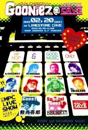 次回、GooNieZ Vol.10は「2010/02/20」開催! GUESTにはKREVAが率いる「くレーベル」の看板トラックメイカー&DJ 「熊井吾郎」が横浜に初の単独出演。 http://mixi.jp/view_community.pl?id=2158653 AKAI主催MPCバトル2009において優勝したGooNieZレギュラー「U☆SEI」と 決勝出場した「F.U.T」と「熊井吾郎」の3人によるMPC LIVE SHOWも行うという 豪華内容!!! もちろんおなじみのレギュラーDJ陣も皆さんのツボをついたプレイをすること間違いなし。 ------------------------------------------------------------ ●開催場所