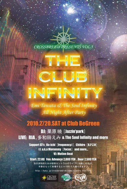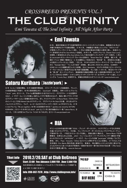 管理人様、告知失礼いたします。 不適切であれば、削除をお願いします。 去年の10/24に開催した Jazzin'park 3rd album release tour in Okinawa(http://bestclubs.in/events/id/2946) にゲストボーカルで出演した『多和田えみ』(http://emi.ti-da.net/) のワンマンライブが2/20に沖縄桜坂セントラルで行われます。 ↓↓↓ そしてなんと!!! そのアフターパーティーをCROSSBREED(http://katy.jp/crossbreed-okinawa/) オーガナイズで開催することが決定しましたわーい(嬉しい顔) そのゲストDJはJazzin'parkの栗原 暁氏!!! (htt