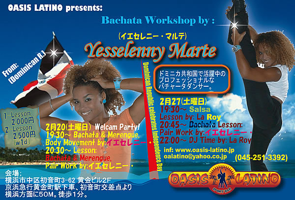 20日と27日の1週に渡って、 ドミニカ共和国で活躍中のプロダンサー、 Yesselenny Marte (イエセレニー・マルテ)の Bachata & Merengue スペシャルワークショップ!! 愛称は、ジェシー。 ●2/20日タイムスケジュール 18:30〜 Open 19:30〜 Bachata & Merengue, Body Movement by: イエセレニー・マルテ 20:30〜 Bachata & Merengue, Pair Work by: イエセレニー・マルテ 21:30〜 Dj Time ●2/27日タイムスケジュール 18:30〜 Open 19:30〜 Salsa Lesson by:La Roy 20:45〜 Bachata & Merengue, Pair Work by: イエセレニー・マ