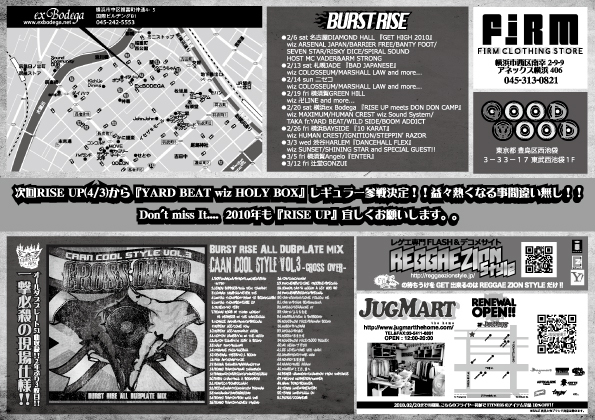 告知失礼します。 2010/02/20 sat 『RISE UP meets DON DON CAMP -New Year Special-』 @ex Bodega -SPECIAL GUEST SOUNDS- MAXIMUM HUMAN CREST wiz Sound System -SOUNDS- WILD SIDE TAKA fr,YARD BEAT BOOM ADDICT -FOOD- Good Wood Terrace Hosted by BURST RISE OPEN 24:00 ADM \2000 w/1D 偶数月第一土曜のBURST RISE レギュラーダンス 『RISE UP』 (今回のみ都合により第3土曜開催) 2010年1発目のゲストは、埼玉から久々登場 『MAXIMUM』 地元横浜からは、自慢のS