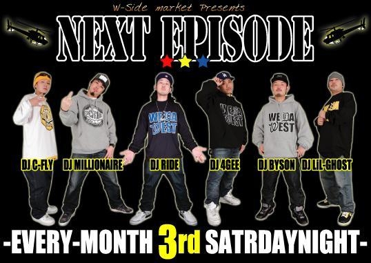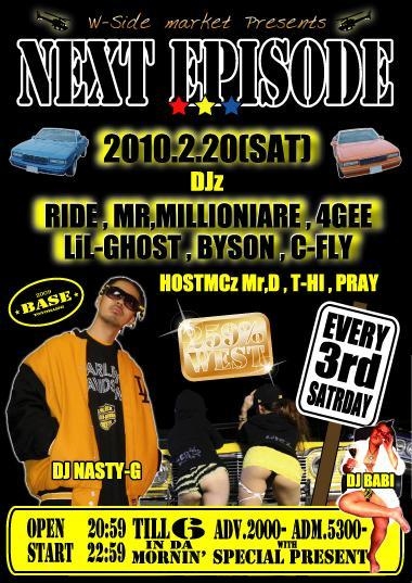 W−SidemarketPresents EVERY−MONTH3rdSATRDAYNIGHT NEXTEPISODE Vol.29 2010.2.20(SAT) OPEN 20:59 STRAT 22:59 TILL 6 IN DA MORNIN’晴れ ADV.2000− ADM.5300− @CLUB BASE ■NEXTEPISODEDJz  RIDE  MR,MILLIONIARE  4GEE  LiL−GHOST  BYSON  C−FLY ■SPECIALGUESTD