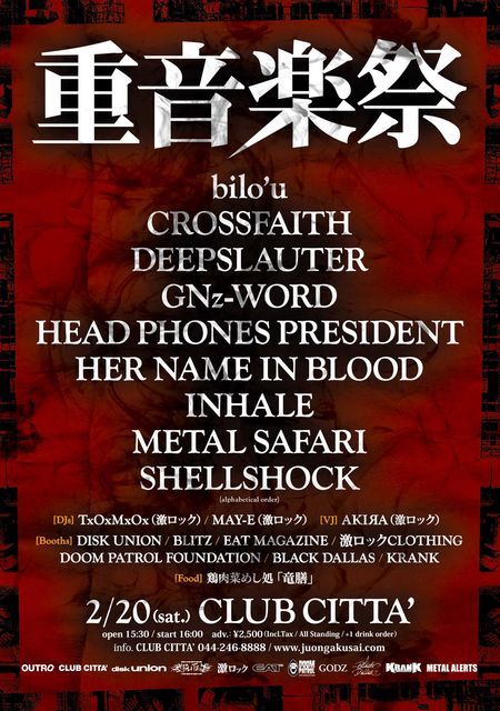 大阪でOUTRAGEのオープニングアクトを務めさせて頂きましたINHALEと申します。 管理人様告知失礼致します。 第4回目となるビッグイベント【重音楽祭】が迫ってまいりました! 色々なブースやイベントが盛りだくさん! 是非お見逃しなく! チケットは当日の昼頃まで受け付けております。 ■チケット予約フォーム http://form1.fc2.com/form/?id=337797 ■INHALEオフィシャルWebサイト http://www.inhale-web.com/index-j.php みなさま是非参戦宜しくお願いします! 02月20日(土)神奈川・ 川崎 CLUB CITTA' 時間:開