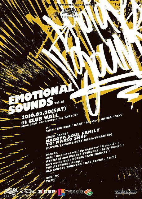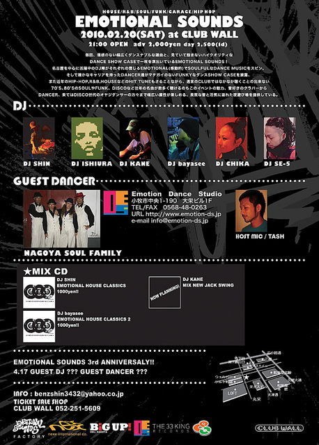 管理人様、告知宜しくお願い致します! EMOTIONAL SOUNDS vol.18 HOUSE.R&B.SOUL.FUNK.GARAGE.HIP-HOP 2.20 at CLUB WALL 21:00〜.adv\2000 day\2500<1d> ・EMOTIONAL DJs SHIN ISHIURA KANE bayasee CHIKA SE-5 GUEST DANCER NAGOYA SOUL FAMILY YO! MASSO SHOP (KATSU,YO-SUKE,COZY,NANA,YURI,RINO ) EMOTIONAL DANCER daft inspire sorce Up 2-gether にっぷくるー AZUMARI and BUBBLE SWINGERS Dolly Bump☆ Girl meets Boy BOOGIE JACK MONKEY THE AVERAGE Pump OLD