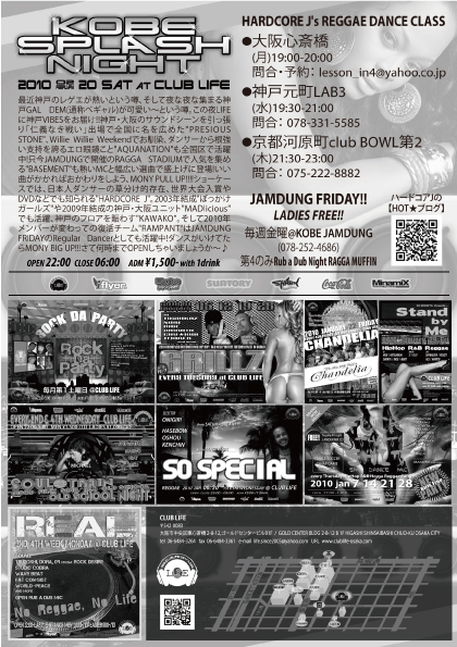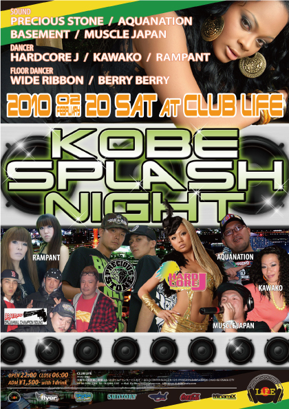 2/20(土)KOBE SPLASH NIGHT@心斎橋LIFE 大阪市中央区東心斎橋2-8-12ゴールドセンタービルB1 06-6484-3264 22:00-6:00 ADM 1500yen/1d ●SOUND PRECIOUS STONE AQUANATION BASEMENT MUSCLE JAPAN ●DANCER HARDCORE J KAWAKO RAMPANT ●FLOOR DANCER WIDE RIBBON BERRY BERRY 最近神戸のレゲエが熱いという噂、そして夜な夜な集まる神戸GAL DEM(通称べギャル)が可愛い〜という噂。 この夜LIFEに神戸VIBESをお届け!! 神戸・大阪のサウンドシーンを引っ張り「仁義なき戦い」出場で全国に名