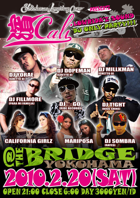 管理人様、告知失礼します。 YOKOHAMA LOWRIDERZ CREW PRESENTZ DJ ONLY PARTY!!! [濱CALI] 毎月第3土曜日の@THE BRIDGE YOKOHAMAを賑わせてる[濱CALI] 2月は名古屋からDJ DOPEMAN、DJ YORAE、DJ MILLKMANが来濱!!! GHETTOでDOPEなSOUNDを聴かせてくれます! レギュラーのDJ FILLMORE、DJ GO、DJ T!GHTも健在!!! DJ ONLY、濱SOUNDを堪能したければ是非遊びに来て下さい!!! 開催日時 : 2010年2月20日(土) OPEN 21:00 CLOSE 6:00 入場料金 : 当日3000yen/1D --- メッセージ頂ければディスカウント取
