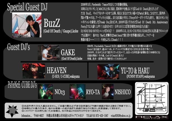 2010 2/20【Sat】 Psychedelic Trance Party ◇PsYeNcE CUBE 13th◇ @Club RELAX OPEN 22:00 CLOSE 5:00??  ENTRANCE FEE.. on the day \1500 with fryer \1000 +1DRINK \500 □Special Guest DJ's ◇BuzZ (God Of Death / Guapo). Kobe 2006年3月、Psychedelic TranceのDJとして活動を開始。 同時にDJ PO-PO、DJ MACOらと共に現在、関西神戸を拠点にする『God of Death』 を立ち上げたDJ BuzZ。 キャリアをスタートさせて以降、現在に至るまで大小様々なPartyに参加。 これ