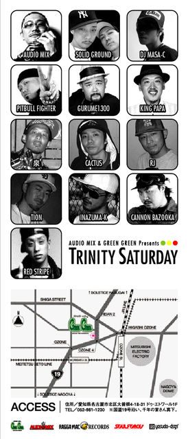 2010/2/20/SAT AUDIO MIX & GREEN GREEN PRESENTS TRINITY SATURDAY @Sound Cafe Green Green 名古屋のベテランサウンドAUDIO MIXとDEEJAY陣が見せるRUB A DUB SHOWCASEは必見! <SOUND> AUDIO MIX SOLID GROUND DJ MASA-C <DEEJAY> RAGGA MAC FAMILY SOUL FORCE 泉 CANNON BAZOOKA INAZUMA-K RED STRIPE <TICKET> 前売¥1500-1D 当日¥1500 <OPEN> 22:00 <INFO> Sound Cafe Green Green 名古屋市北区大曽根4-18-31 ?052-981-1230 ✉greengreen-@hotmail.co.jp