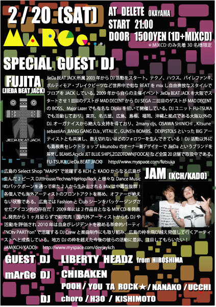 今回、一回目となる、ファッションとクラブを融合させたエレクトロパーティー「mArGe」! 第一回目、ゲストDJは・・・・ まさに現在のファッションアイコン、セレクトショップkikunobuのオーナー兼デザイナーでJieDaというブランドを展開しBEAMS.Acycle JET BLUE SHIPS,ZOZOTOWN(FOOCA)など全国20店舗で取扱中、1月24日に自主企画、JIEDA BEAT JACKにてMAJOR LAZERでも有名なDIPLOを招き、さらには2many djs,OSAWA SHINICHI , Kitsune , sebastiAn , BANG GANG DJs , VITALIC , GUNS'n BOMBS,DEXPISTOLSといったビッグアーティストとも共