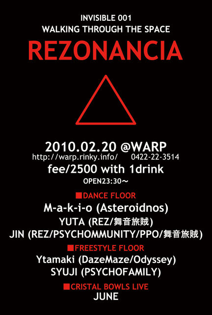 管理人様、∽ Matsuri Productions ∽コミュ参加の皆様、こんばんは。 お知らせをお願いします。 Matsuri Productionsが好きな方も楽しんでいただけると思います! 2010年2月20日(土)より吉祥寺WARPにて始動するREZONANCIAです。 DeepなPsychedelicを追求していきます! REZONANCIAコミュニティです。 http://mixi.jp/view_community.pl?id=4767530 コミュニティの内容を見て、魅力を感じていただけたら嬉しいです★ INVISIBLE 001 WALKING THROUGH THE SPACE REZONANCIA 2010.02.20 (Sat) departure 23:30