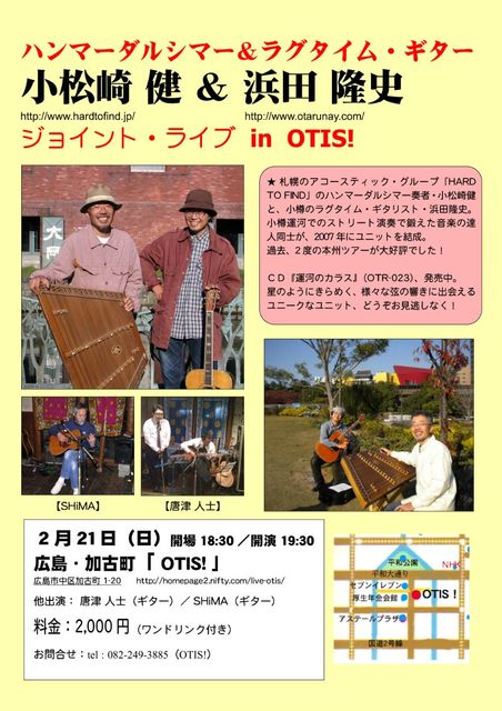 ★2月21日(日) 開場18:30/開演19:30 広島・加古町 OTIS! (広島市中区加古町1-20/広島駅より24番のバス、厚生年金会館前下車) http://homepage2.nifty.com/live-otis/ 出演:浜田 隆史(ギター)/小松崎 健(ハンマーダルシマー) /SHiMA(ギター)/唐津 人士(ギター) 料金:2,000円 (1ドリンク付き) お問い合せ:tel: 082-249-3885(OTIS!) 泣いても笑ってもツアー最終日、おなじみ広島のOTIS!さんでのライブです。 フィンガースタイル・ギターのSHiMAさん、唐津人士さんも