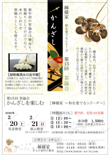 着付け教室檸檬家よりお知らせいたします! 第15回茶論会『かんざしを楽しむ』を開催いたします 記 第15回 茶論会のご案内 『かんざしを楽しむ』 日時・場所/2月20日(土)尾道教室 2月21日(日)福山教室(おしゃれ工房2F) 両日とも 13:00〜 14:30〜 16:00〜 (所要時間:約1時間/簪のお話と制作時間含む) 参加費/1,500円 お茶とお茶菓子付き(要予約 定員30名様) 新年初の茶論会は講師に木村先生をお迎えして簪(かんざし)作りをいた