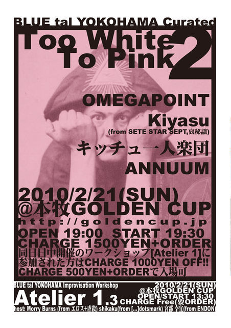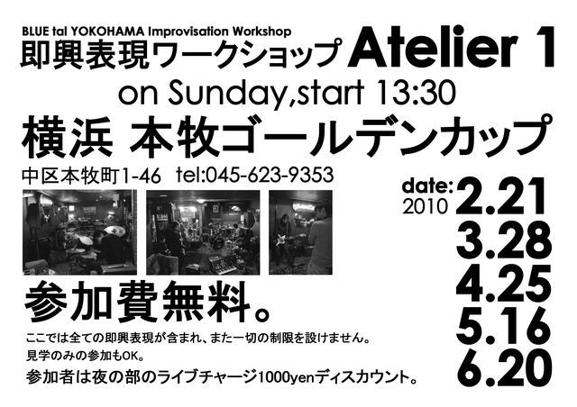 BLUE tal YOKOHAMA Improvisation Workshop 「ATELIER 1.3」 2010 2.21(Sun)横浜 本牧ゴールデンカップ http://goldencup.jp/ host: Morry Burns (from エロス+虐殺) shikaku(from [...]dotsmark) 宮部 幸宜(from ENDON) sound equipments by M.A.S.F OPEN&START 13:30(~17:30) CHARGE Free(要オーダー) 「ATELIER 1」はBLUE tal YOKOHAMAの提案する即興表現のワークショップです。 ここではすべての即興表現が含まれており、また一切の制約を設けません。 新たな価値観を模索できるアトリエとしてこの時代に機能で