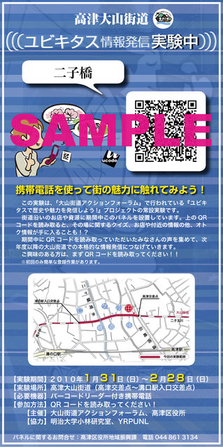 【携帯電話を使って街の魅力に触れてみよう!】 みなさんお久しぶりです!管理人のCAT犬です 実は今、大山街道にて、「ユビキタス情報発信実験」というものを行っています! 前回(11月)はゲームイベントを行いましたが、 今回は1ヶ月間(実は月初めから)の設置期間を設けて、 常設していたらどのくらいの方に利用してだけるかを調べております 一部の店舗にご協力いただき、 QRコードを読み取った際におトクなクーポンを手に入れる事もできます <設置場所> ・カフェマロリーワイス ・大石橋 ・岩崎酒店 ・