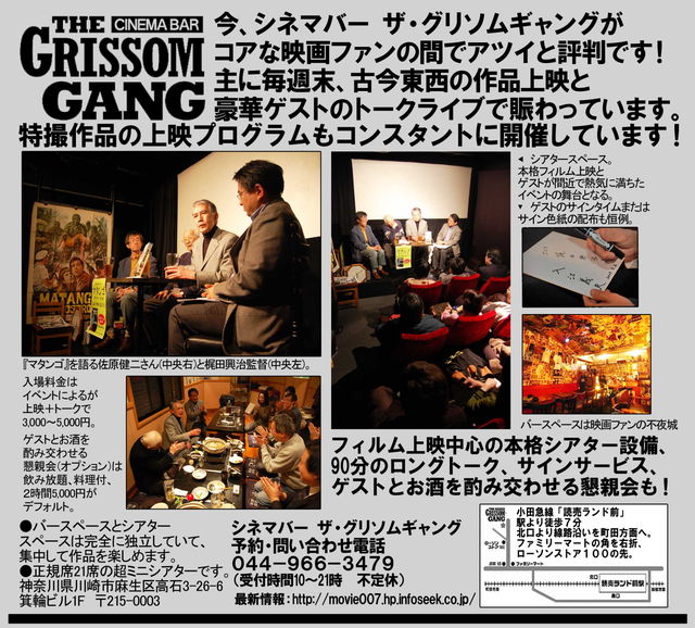 まいどの告知ですみません。 ゴジラ最終作『ゴジラ FINAL WARS』ほか、 『ゴジラvsメカゴジラ』『ゴジラ×メガギラス』 『ゴジラ×メカゴジラ』など多数のゴジラ脚本で知られる脚本家、三村渉さん。 三村さんの初監督作品『不思議めがね』の上映が決定しました。 ■日程 2月21日(日) 2月28日(日) ■会場 読売ランド前の超ミニシアター 「シネマバー ザ・グリソムギャング」 (補助席含め25席) ■料金 映画上映+トークショー 予約1,500円、当日1,800円 終演後三村監督を囲んでのオプション懇親会 5,000円