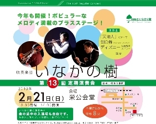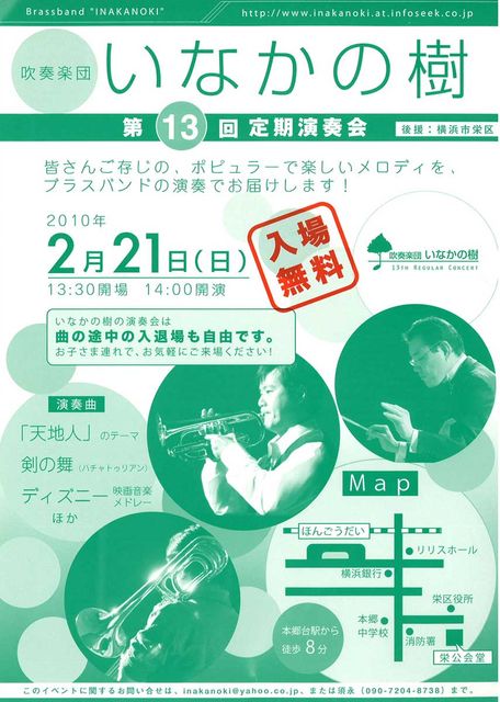 突然の書き込み失礼いたします。 私たちは横浜市内を中心に活動しております「吹奏楽団いなかの樹」と申します。 この度、第13回定期演奏会を行いますのでご案内申し上げます。 小さなお子様とご一緒に楽しめるように曲中の入退場の制限をしておりません。 一曲だけでも、お子様連れでお気軽にご来場下さい。 皆様のご来場を心よりお待ち致しております。 【吹奏楽団いなかの樹 第13回定期演奏会】 日時: 2010年2月21日(日)開場13:30開演14:00 曲目: NHK大河ドラマ「天地人」オープニングテーマ わらべうたつづり ミュージカ