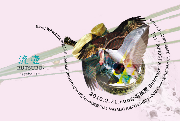 親愛なる流壺ヘッズのみなさま、こんにちは。 急遽ですが第四回目の流壺が開催決定致しました! 今回もカオスでトライバルでジャムな一夜になること必至!! 是非ともShantiな空間を一緒に楽しみましょう◎ (((流壺-RUTSUBO- sector 4))) [LIVE] ◆WAWAWA http://mixi.jp/view_community.pl?id=2305631 http://www.myspace.com/wawawatune ◆打楽 http://mixi.jp/view_community.pl?id=3410992 [DJ] ◆SharpkiD(beatstroganoff) http://www.myspace.com/djsharpkid ◆jarrin(流壺/HAL.MASALA) http://jarrincha.exblog.jp/ ◆Ha