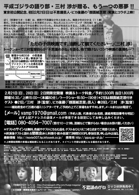 告知で失礼します。 「ゴジラ×メカゴジラ」などゴジラシリーズ脚本、三村渉氏のイベントです。 三村氏の監督作「不思議めがね」を、 ご本人のトークイベントつきで上映します。 ■日程 2月21日(日) 2月28日(日) ■価格 映画(80分)+トークイベント(90分) 予約1,500円 当日1,800円 ■みどころ 「不思議めがね」はゴジラとはまた違う、不思議な味わいの傑作ファンタジーです。 トークショーや質問タイムではゴジラや機龍の裏話も聞けます。 21日は、不思議な大道芸「顔面紙芝居」も見られるなど楽しみが盛りだく