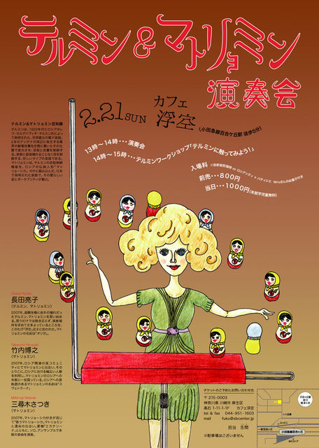 ※2月8日情報追加 申し訳ありません。予約の受付も終了させていただきました。 ※2月6日情報追加 申し訳ありませんが、当日の受付をとりやめさせていただきます。 ご予約に関しましても残席わずかとなっております。 カフェ宛直接ご連絡ください。 イベントお知らせ失礼いたします。うにょと申します。 下記イベントで、テルミンとマトリョミンをうっかり弾いてみます。 うっかりな上に初めてなので、お耳汚しになるやもしれませんが、 よろしければお越しください。 小さなお子様もどうぞ。 ------------------