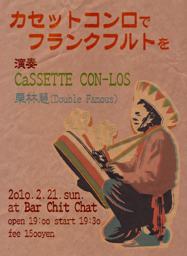 さあ今年も開催決定! Bar Chit Chatの店主が毎年何かを カセットコンロで焼くという 馬鹿げたイベントも御陰さまで6回目! (今まで、焼きオニギリ、ネギ間、みたらし団子,ミニトマベーコン巻き,厚揚げ) 今年は何カセットコンロスの要望でフランクフルト!。 カセットコンロスの学祭のようなイベントへ 是非いらっしてください 。 Opening ActにはDouble Famousのリーダー 栗林慧(ウクレレ、ギター)!! 『カセットコンロでフランクフルトを』 2010.2.21.日. at 新百合ケ丘Bar Chit Chat (小田急線新百合ケ丘駅南口徒歩3分) 神奈