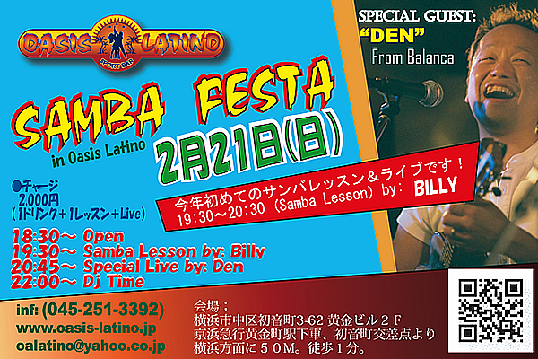 今年初めてのサンバレッスン&ライブです! [逆瀬川“DEN”幸大]率いる日本一のサンバ・カーニバル・ライブ&ショー!! http://www.balanca.net/profile.html 19:30〜20:30 (Samba Lesson)by Billy 20:40〜21:40 (Live by DEN) 21:40〜 DJ Time チャージ 2,000円 (1ドリンク+レッスン+Live!) ●お問い合わせ オアシスラティーノ 横浜市中区初音町3-62 黄金ビル2F Tel:045-251-3392