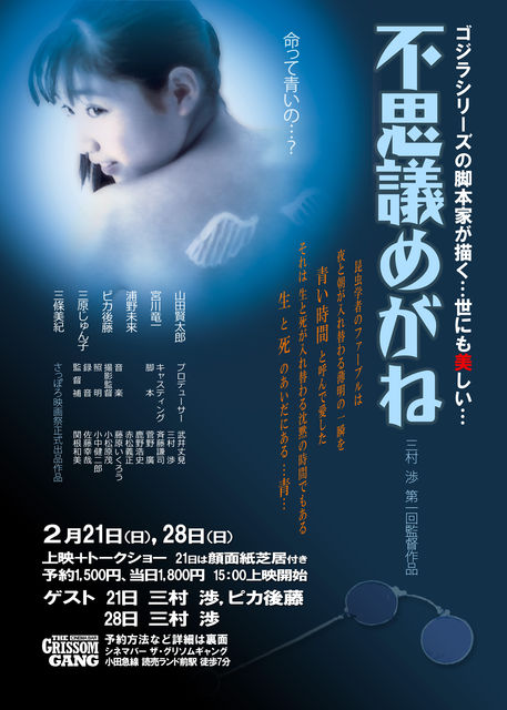 緊急決定! グリソムギャング2月企画『不思議めがね』、予約スタートしました。 ■ゴジラの語り部が贈る、もうひとつの悪夢 『不思議めがね』上映&トークイベント <日程> 2月21日(日) 2月28日(日) 15:00上映スタート <料金> 予約1,500円 当日1,800円 ★安いです! 懇親会 5,000円 <イントロダクション> 三村 渉――『ゴジラvsメカゴジラ』『ゴジラvsメガギラス』『ゴジラ×メカゴジラ』などの脚本家である。 また、作家性の高い作品を発表する映画監督、プロデューサーとして独自の活動を続けている
