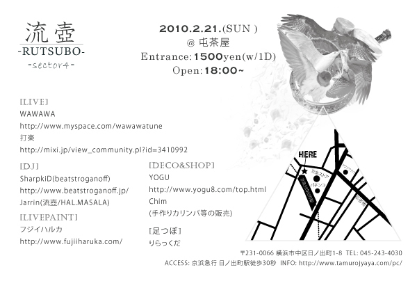 告知失礼致します。 コミュニティのみなさま、こんにちは。 日ノ出町屯茶屋にて第四回目の流壺が開催決定! 今回もカオスでトライバルでジャムな一夜になること必至!! 是非ともShantiな空間を一緒に楽しみましょう◎ (((流壺-RUTSUBO- sector 4))) [LIVE] ◆WAWAWA http://mixi.jp/view_community.pl?id=2305631 http://www.myspace.com/wawawatune ◆打楽 http://mixi.jp/view_community.pl?id=3410992 [DJ] ◆SharpkiD(beatstroganoff) http://www.myspace.com/djsharpkid ◆jarrin(流壺/HAL.MASALA) etc... [LIVE PAI