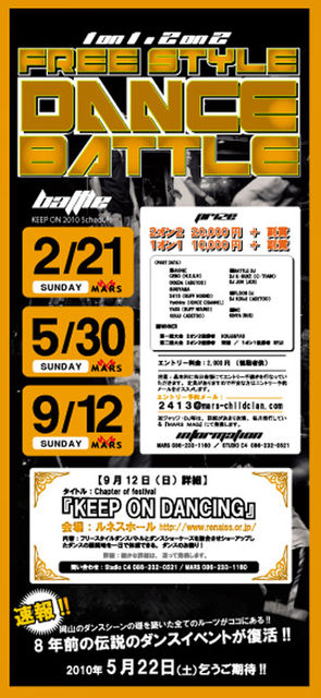今回で第三回目を迎える事になりました! 『KEEP ON DANCING』がお届けする 1オン1&2オン2 フリースタイルダンスバトルです! グランドチャンピオンシップの開催も決まり盛り上がることマチガイナシ! 是非、挑戦してみてください! ■日程:2010年 2月21日(日) ■タイトル:KEEP ON DANCING FREE STYLE DANCE BATTLE ”1on1 & 2on 2” ■会場:MARS http://www.mars-childclan.com http://mixi.jp/view_community.pl?id=1885462 ■エントリー開始 :