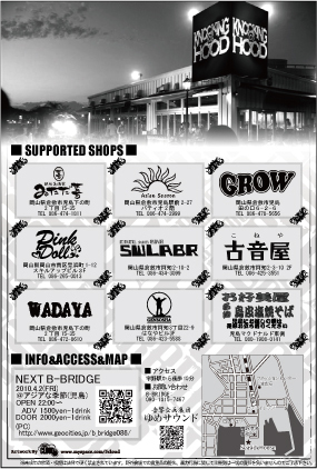 以下、イベント詳細です。 「ゆめサウンド★TAMANO」のメンバーの方で、 前売チケットをご希望の方がいらっしゃいましたら、 SASAKI BANDまでご連絡下さい。 当日、前売り料金で入場できるよう手配致します。 **************************************************************************** B-BRIDGE PRESENTS… ☆KNOCKING@HOOD Vol.1 2010.2.21(SUN) @Seaside House (玉野) OPEN 13:00 CLOSE 20:00 ADV:1000[1D] DAY:1500[1D] MC DH64'/SGK/P-J/金若/DST/Light HopE/N.E.B.C/2 FACE RECOR