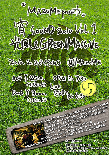 今年から 不定期ですが わたくしの おススメするアーティストを お招きしての ライブイベントを 開催して参ります その名も [宵SOUND] 当店の名前の由来 明け方 夕方の時間帯 良い もちろん 酔い と かけてみました その第一弾 決定です MAZUME presents 宵SOUND vol.1 光風&GREENMASSVE 2010.2.28(SUN) OPEN 7:30 STRT 8:30 前売り¥2500(1ドリンク) 当日¥3000(1ドリンク) 県北では 貴重ライブ 是非とも 盛り上がって参りましょう