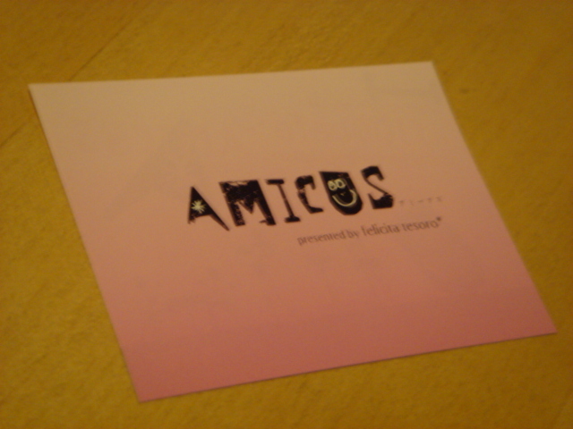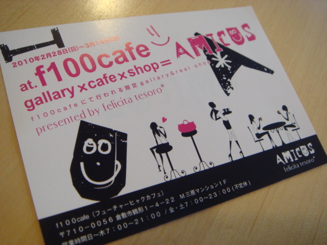 告知失礼します。 ネットを中心にアクセサリーを販売していますfelicita tesoro*と 申します。 このほどギャラリーを開きますので お知らせいたします。 「Amicus」(アミークス) ラテン語で友という意味になります ずっと大切でいられる風景を見つけられるような 展示会になってほしいという思いからです 期間*2010年2月28日(日)〜3月14日(日) 場所*「f100cafe(フューチャーヒャクカフェ)」 倉敷市鶴形1−4−22 M三原マンション1F 営業時間日〜木7:00〜21:00 金・土7:0
