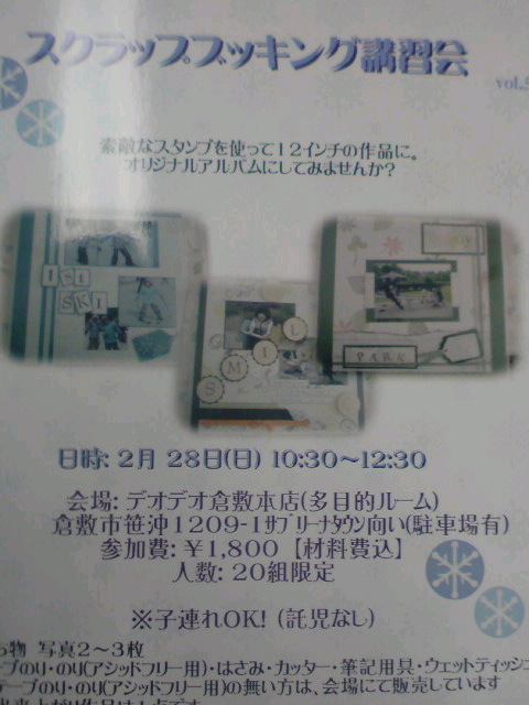 スクラップブッキングをご存知ですか? 簡単に言うとアルバム作りです 今回はスタンプを使って12インチの作品を作ります 日時2/28(日)10:30〜 場所デオデオ倉敷本店 参加費1800円(材料費込み) 持ち物写真2〜3枚、テープのり、のり(アシットフリー)、ハサミ、カッター、筆記用具、ウエットティッシュ 託児はありませんが子連れです。小学生くらいのお子さんなら作品作りも出来ますよ