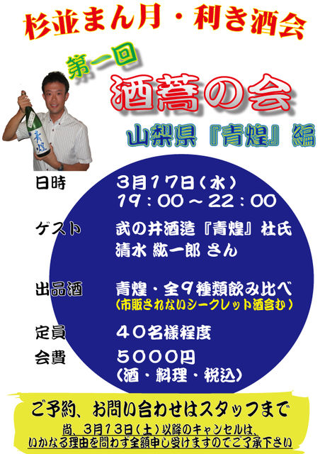 まん月初となる利き酒会、その名も『酒蕎の会』がいよいよ開催されます。 記念すべき第一回目の企画は、 先の雑誌“dancyu”日本酒特集でも取り上げられ、当店でも大人気の山梨県期待のホープ 武の井酒造『青煌』を醸す清水紘一郎さんをゲストに迎え、『青煌』全9種を出品致します。 当会のために特別にご用意して頂くものもございますので、どうぞご期待下さい! ★出品酒(9種予定)★ ・美山錦 純米 (生原酒21BY、瓶火入21BY、ひやおろし20BY) ・五百万石 純米 (生原酒21BY、瓶火入21BY、瓶火入2