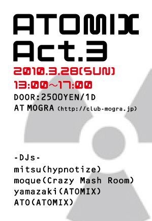 クラブミュージックとあなたが急接近。 4つ打ちオールジャンルダンスイベントATOMIX、進化したAct.3。 ATOMIX Act.3 @MOGRA秋葉原(http://club-mogra.jp/) 2010.3.28(SUN) 13:00〜17:00 \2500/1D ■DJs mitsu(Hypnotyze/Crazy Mash Room) 2008年秋からHouse/Technoを中心にDJ活動を始める。 渋谷EFFECTでのNaotoTaniai氏との出会いからさらに音の幅を広げ、PC主流ながら、 レコード/CDによるハードミニマルを軸とした3デッキでのミックスによって、 既存の曲で新たなグルーヴを作りだすことをモットーにしている。