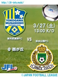 「One Sou1」 Jへの道 共に駆け上がろう! 第12回 日本フットボールリーグ 前期 第3節 横河武蔵野FC vs. 松本山雅FC 2010年3月27日(土) 13:00 キックオフ 国立西が丘サッカー場(東京都) http://www.jiss.naash.go.jp/shisetsu/nisigaoka.html http://www.j-league.or.jp/stadium/nishigaoka/ [初対戦] ◇松本山雅FC <第2節の結果> vs.ソニー仙台FC(H) ● 0-2 [観客数]5,496人 [得点者]なし [警告]玉林(31分) [17位]02試合00勝00分02敗 勝点0 得失点差-5 http://www.yamaga-fc.com/ ◇横河武蔵野