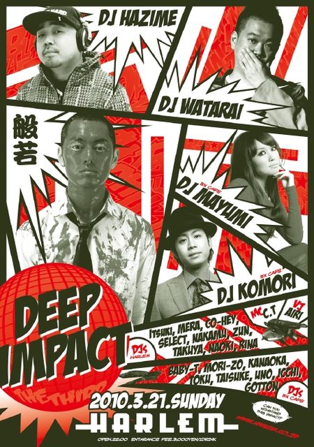 管理人様告知失礼します 3/21(sun) Deep Impact @HARLEM&BXcafe open:22:00 毎回大きな賑わいをみせる〈DEEP IMPACT〉が今回で3度目の登場です! DJ陣にはHAZIME、WATARAI、KOMORI、MAYUMIと 文句ナシのラインナップ。 LIVEには不動の人気〈般若〉がスタンバイ! 充実の祝日前を満喫しよう! メッセージを頂ければ、ゲスト料金2000円1ドリンクにてディスカウントゲストでのご案内ができます! その際、代表者(ニックネーム可)と大体の人数を添えてご連絡いただけたらスムーズにゲストとれますのでメッセージ